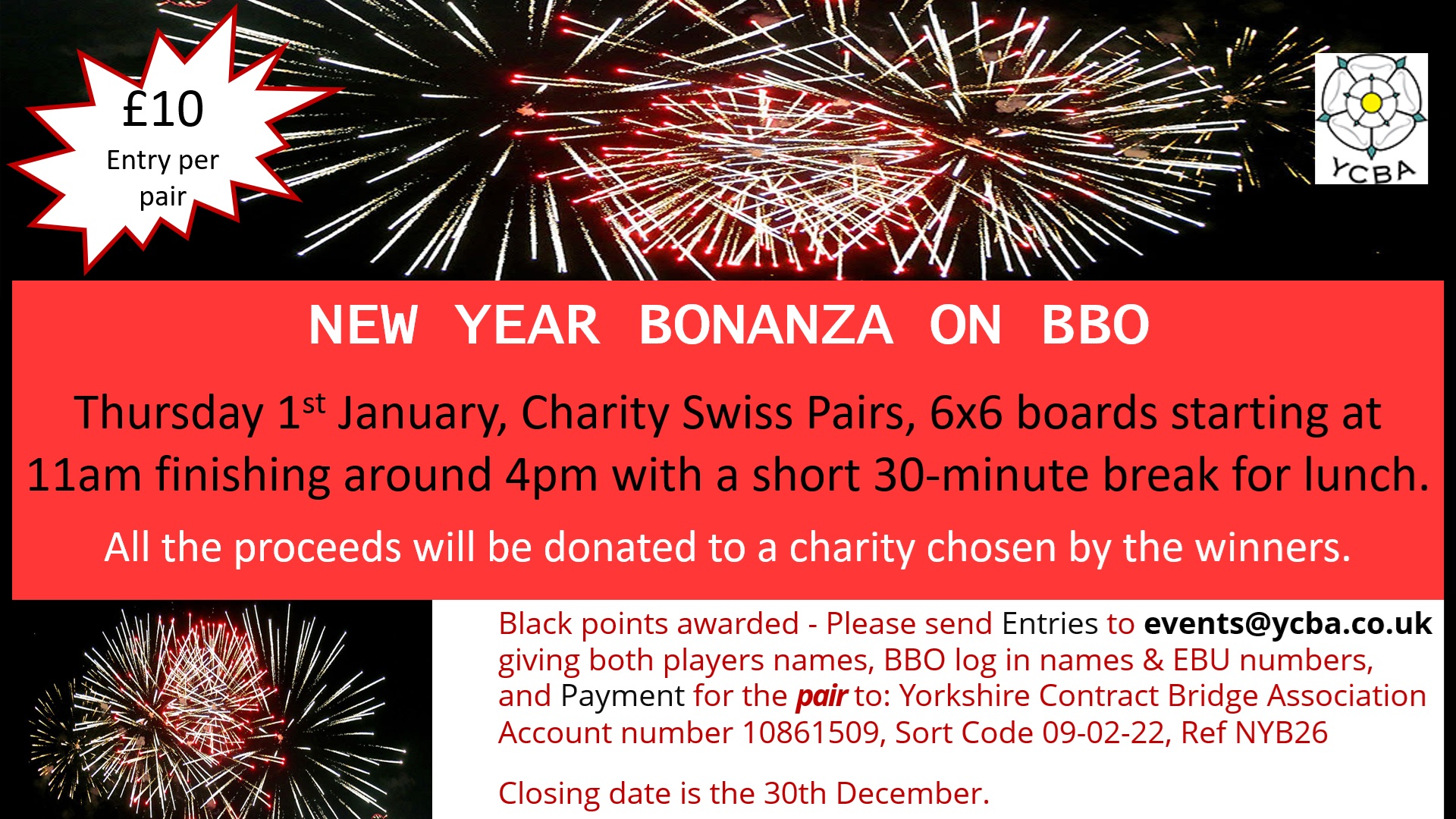Please make your payment by bank transfer to Yorkshire Contract Bridge Association, account number 10861509, sort code 09-02-22, and quote reference NYB26.